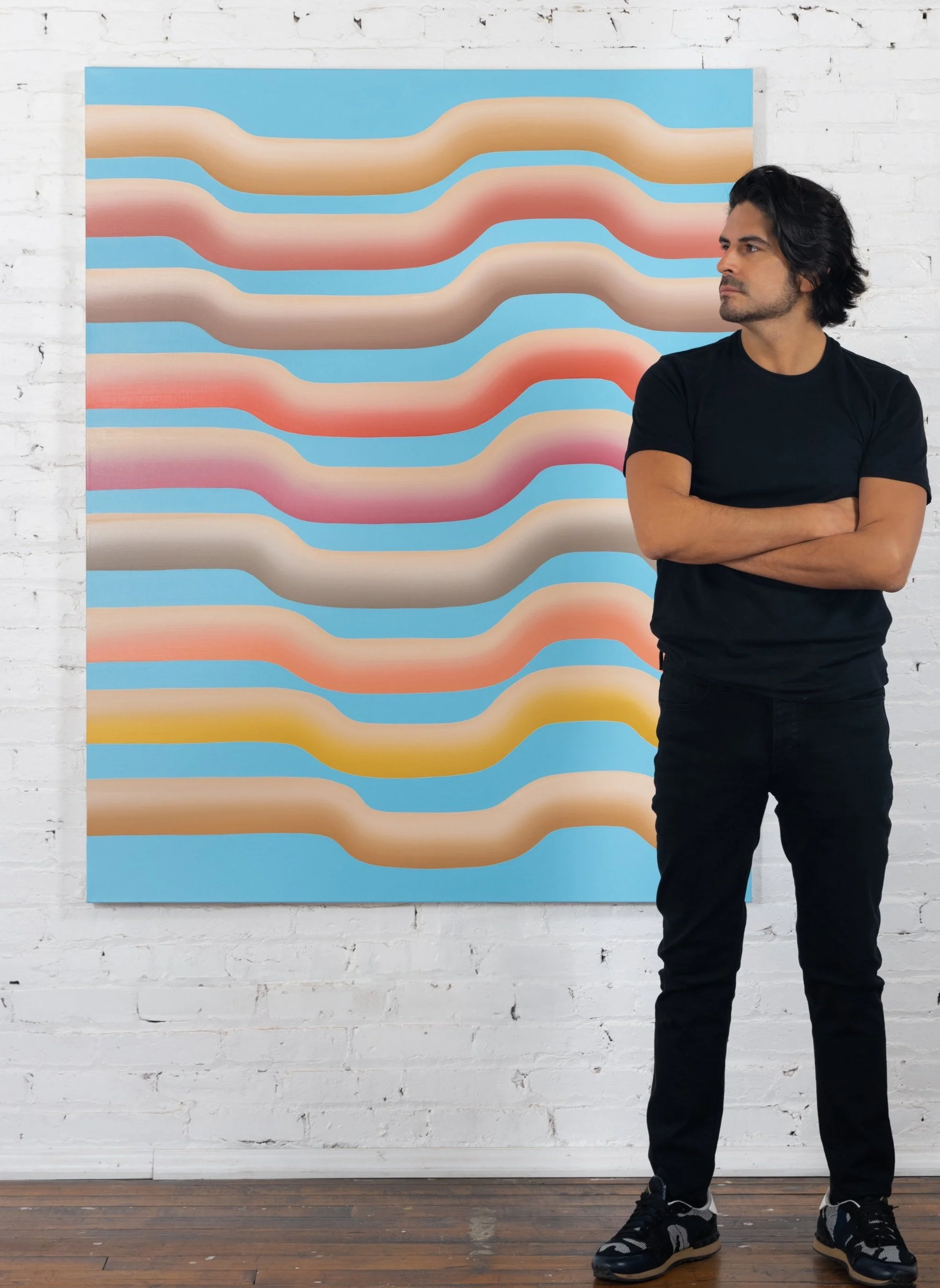 His background in design gives him a keen eye for color and composition, and his interest in exploring human nature through his work was born out of the pandemic. Caceres views his paintings as snapshots from a larger story; with the lines frozen in time, one can imagine them continuing to bend and curve beyond the frame of the painting. Landscape and portrait blend together as the lines move organically, pushing and pulling with each other - just as the natural world and our own bodies record the traumas of the past. Conjuring thoughts like these, Caceres’s work serves as a way for him to meditate on his own personal history, and it provides an outlet for viewers to do the same.